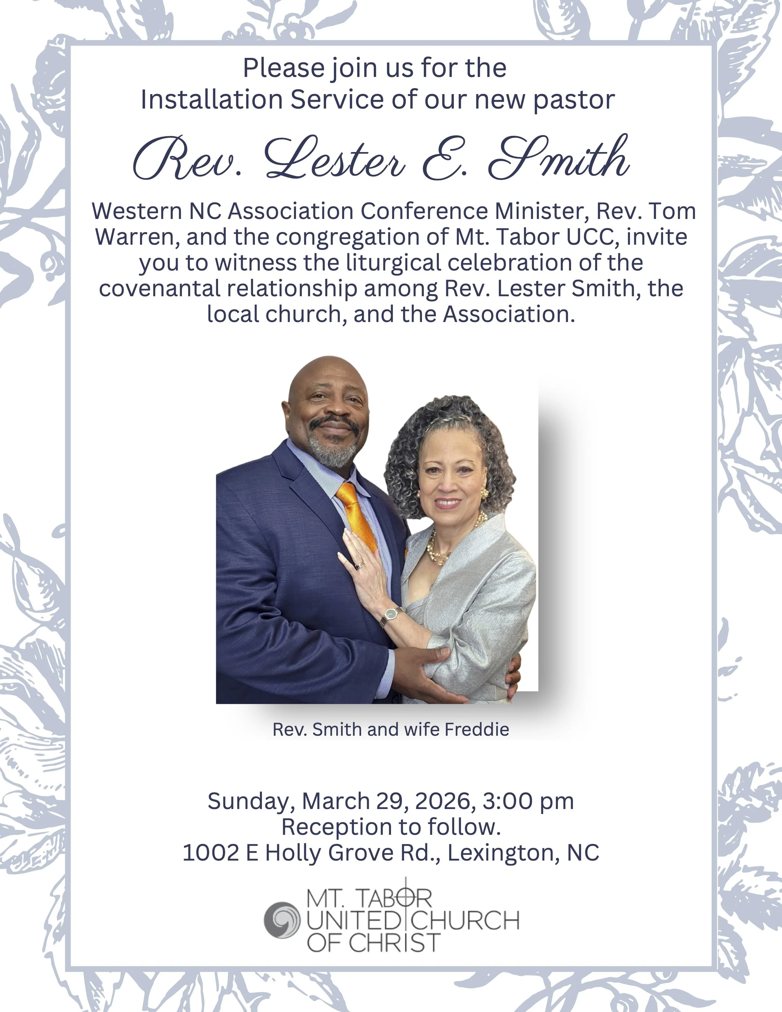 Rev. Smith will be officially installed on Sunday, March 29, 2026 at 3:00 p.m. at Mt. Tabor UCC, 1002 East Holly Grove Road, Lexington, NC 27292. Refreshments will be served following the program.