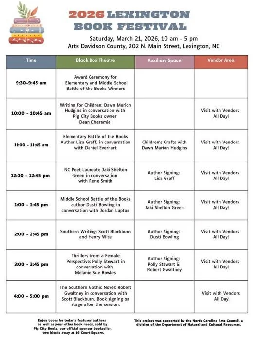 All events will take place at Arts Davidson, located at 202 N. Main Street in Lexington. Look for Lexington Book Festival flags at each entrance.